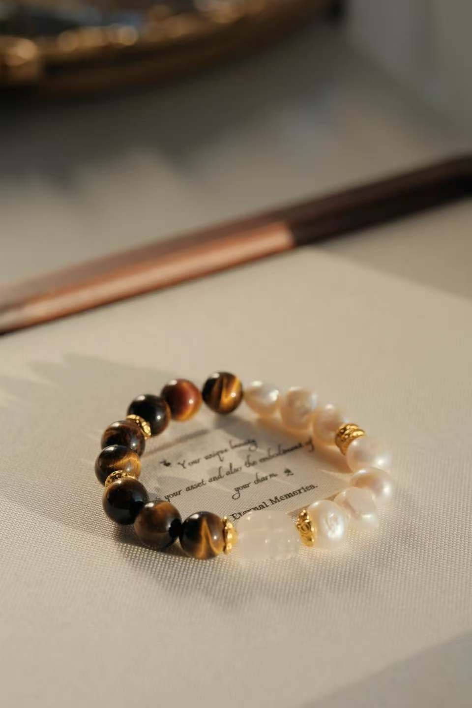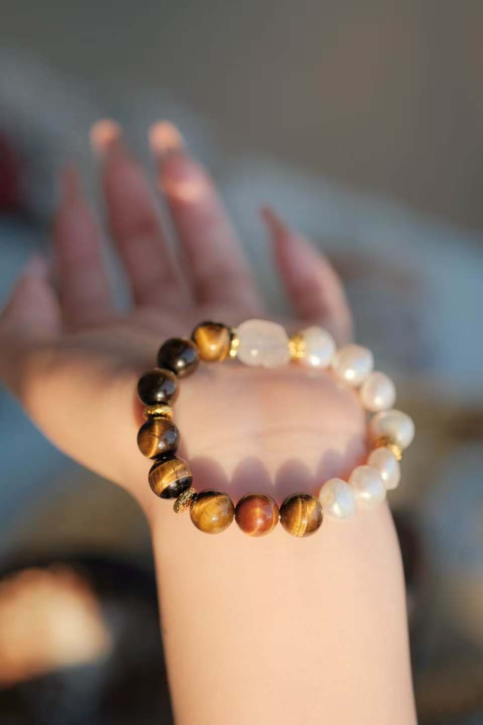“Golden Eye Moon Pearl” – this exquisite crystal necklace, which blends tiger’s eye and pearls, exudes a unique radiance and profound energy. The brilliant golden glow of tiger’s eye and the 温润 luster of pearls shine upon each other, as the elegant qualities of these two natural materials perfectly converge here, symbolizing the clarity of wisdom, the tenacity of courage, and the purity of inner strength. Every “Golden Eye Moon Pearl” harbors the mysterious energy bestowed by nature. When worn, it seems to infuse you with steady faith, allowing you to maintain a firm heart and always exude an elegant texture amid the flow of life.